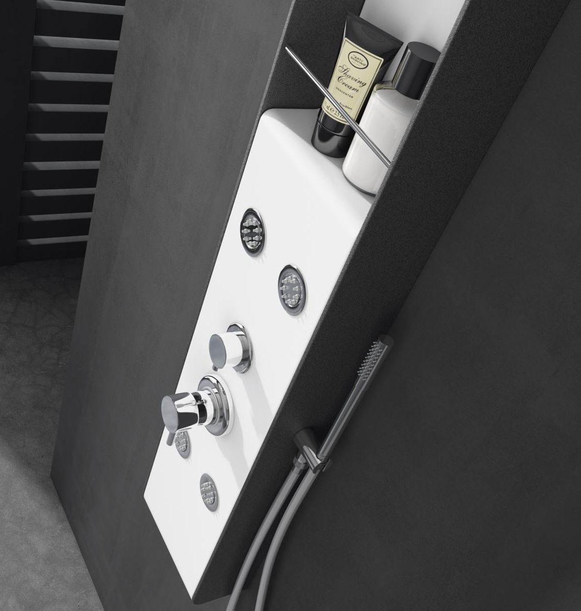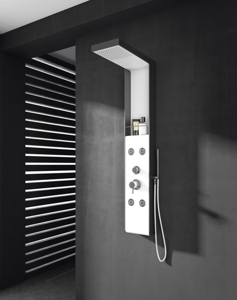 Diseño sencillo e intuitivo, chasis de acero y frente aluminio, 4 jet de hidromasaje orientables y un estante porta gel consiguen un sistema perfecto para tu cuarto de baño