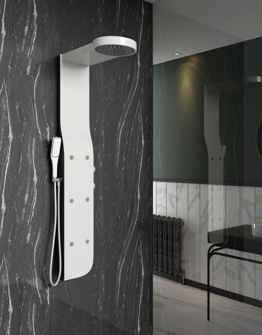 Un diseño maleable, resistente y totalmente ligero gracias a su chasis de aluminio con su duchón orientable y los jet de hidromasaje efecto spray, crean una columna atemporal y perfecta para conectar con nuestro día a día