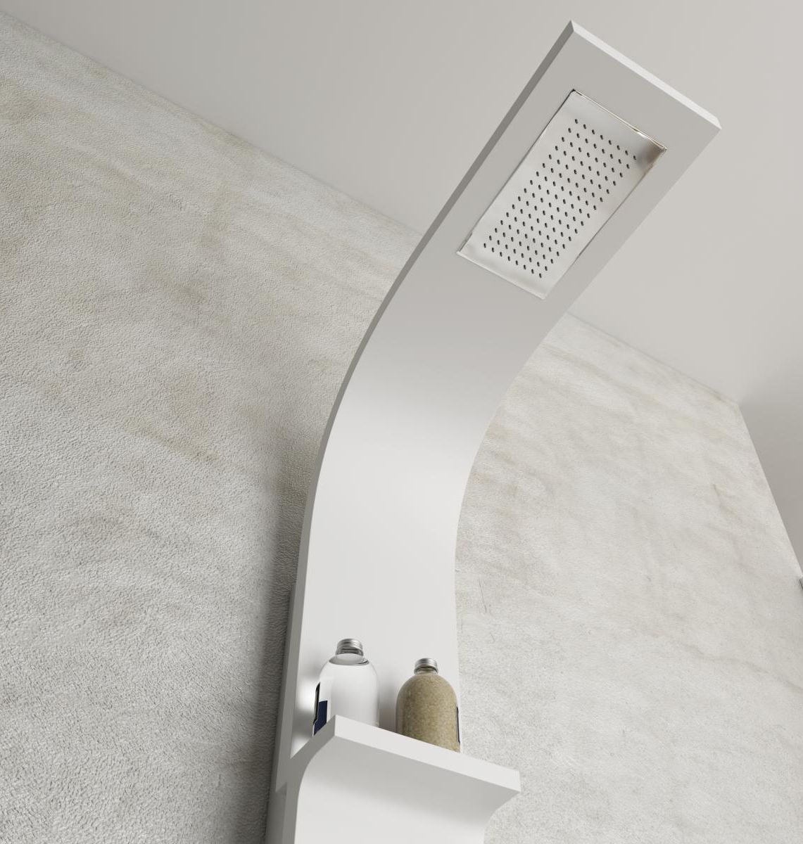Grifería monomando o termostática. Rociador superior con jet efecto lluvia 25x14 cm. 2 jets de hidromasaje fijos. Estante porta gel