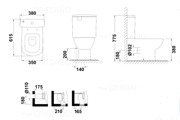 Inodoro completo compacto adosado a pared con salida dual (incluye taza, cisterna de alimentación inferior y tapa con opción caída amortiguada)