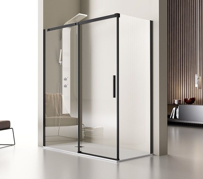 Mampara frontal 1 Fijo + 1 Corredera (+ Lateral fijo) LUNA "con perfileria en negro"