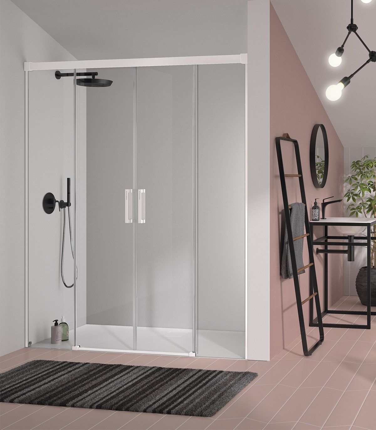 Mampara frontal 2 Fijos + 2 Correderas GLASÉ "con perfileria en blanco"